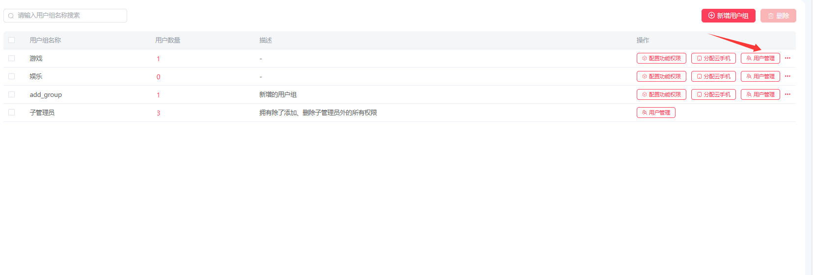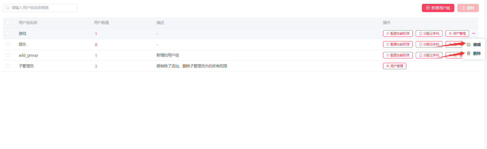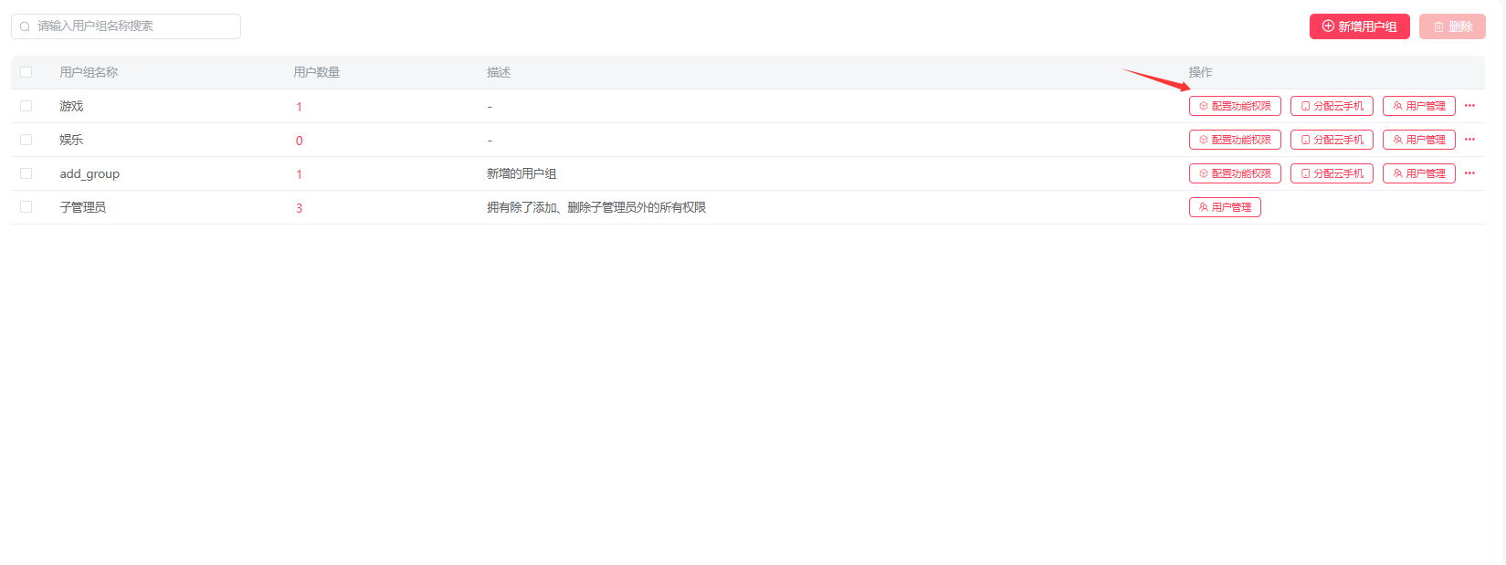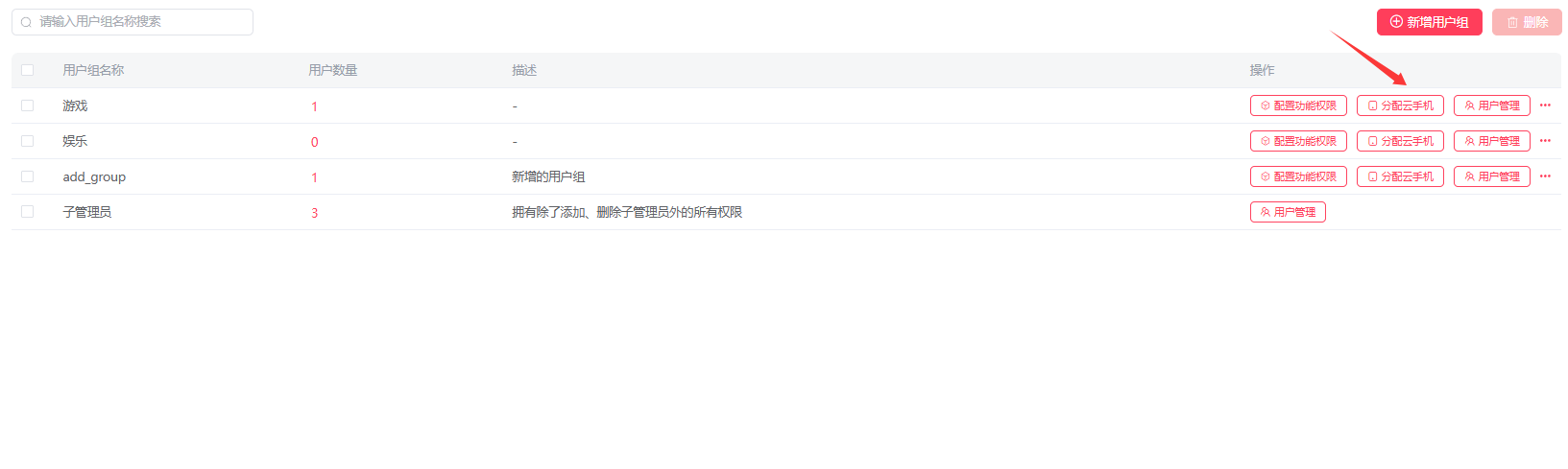 2.1:进入用户组管理页面,先点击分配云手机;