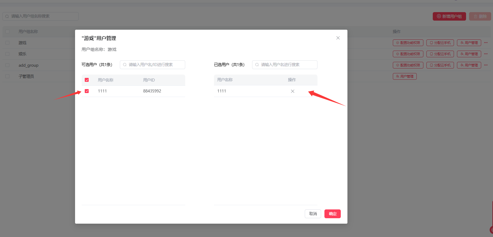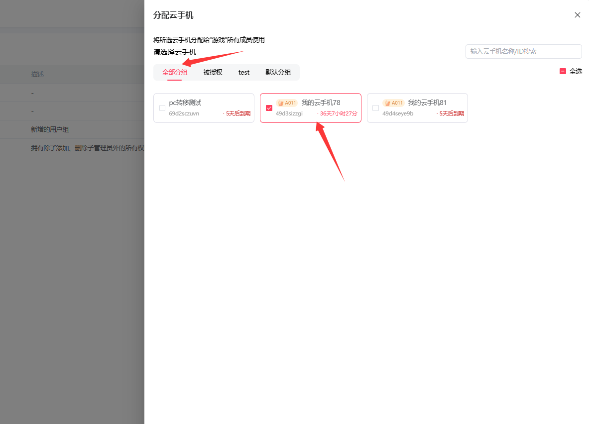 勾选要分配的云手机,再勾选云手机,点击确定,该用户组内所有成员就拥有这些云机的使用权;