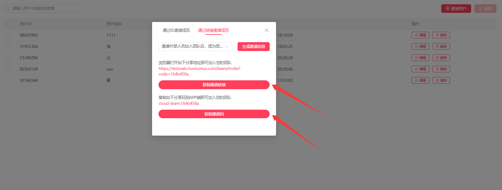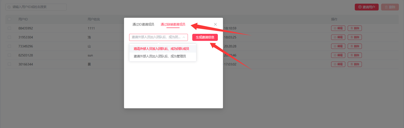 1、通过ID邀请成员 2、通过链接邀请成员;