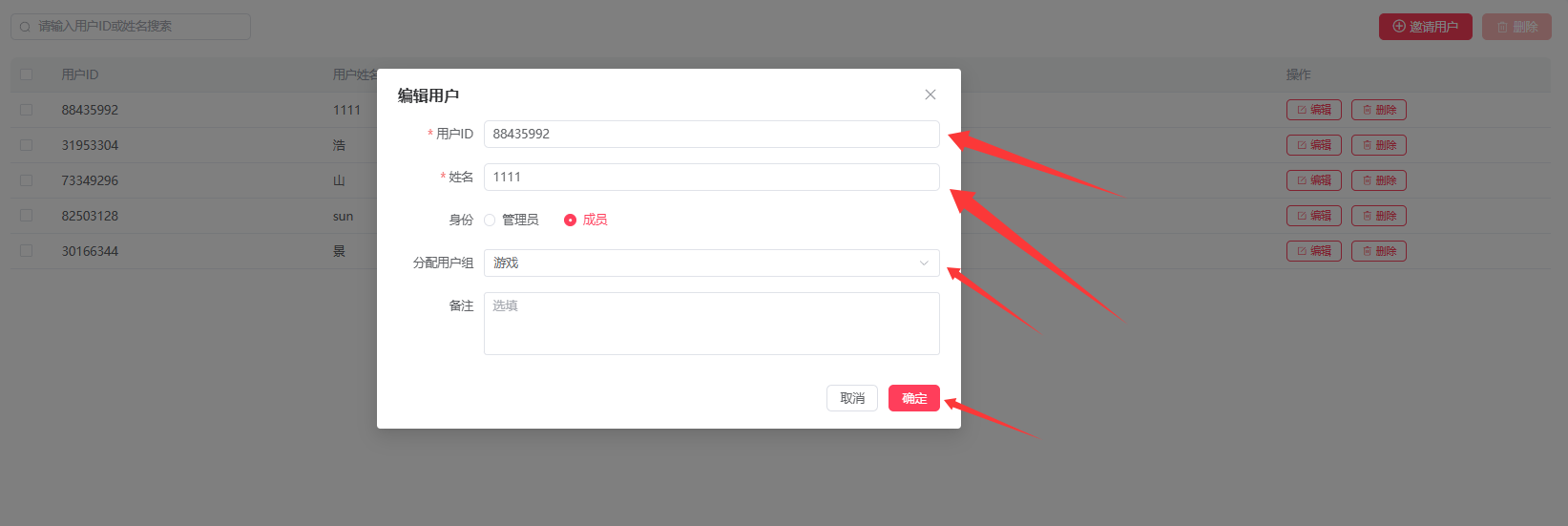 编辑可修改用户ID,姓名,用户组;