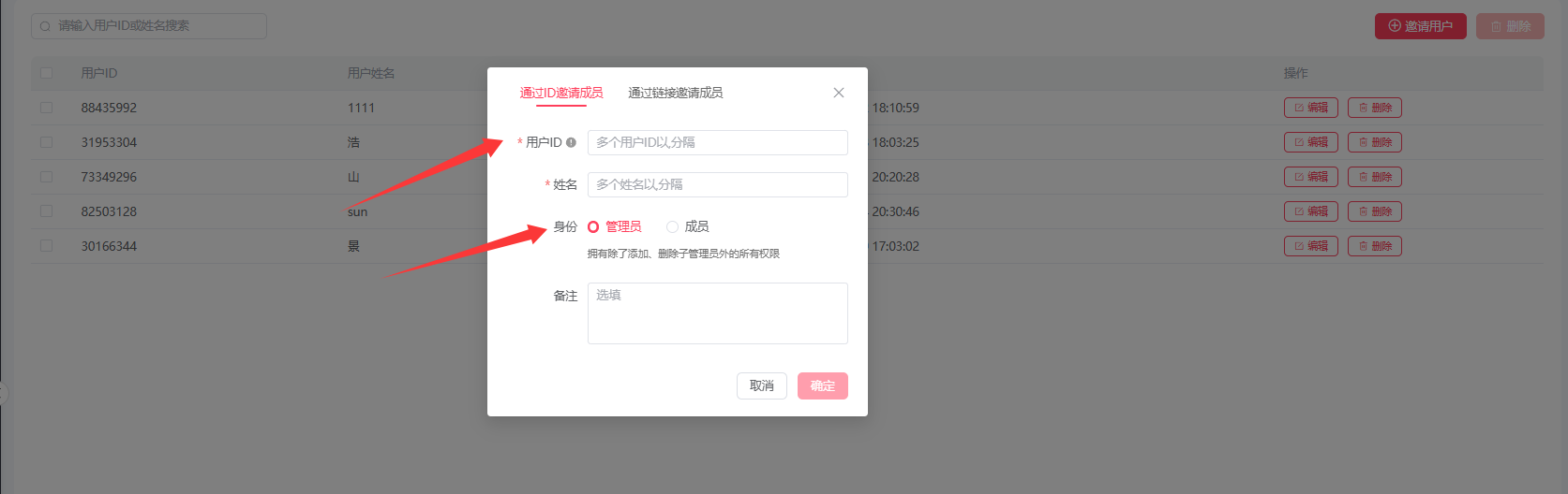 1.1:切换到通过ID邀请成员,需输入用户ID,姓名,身份分为管理员和普通成员