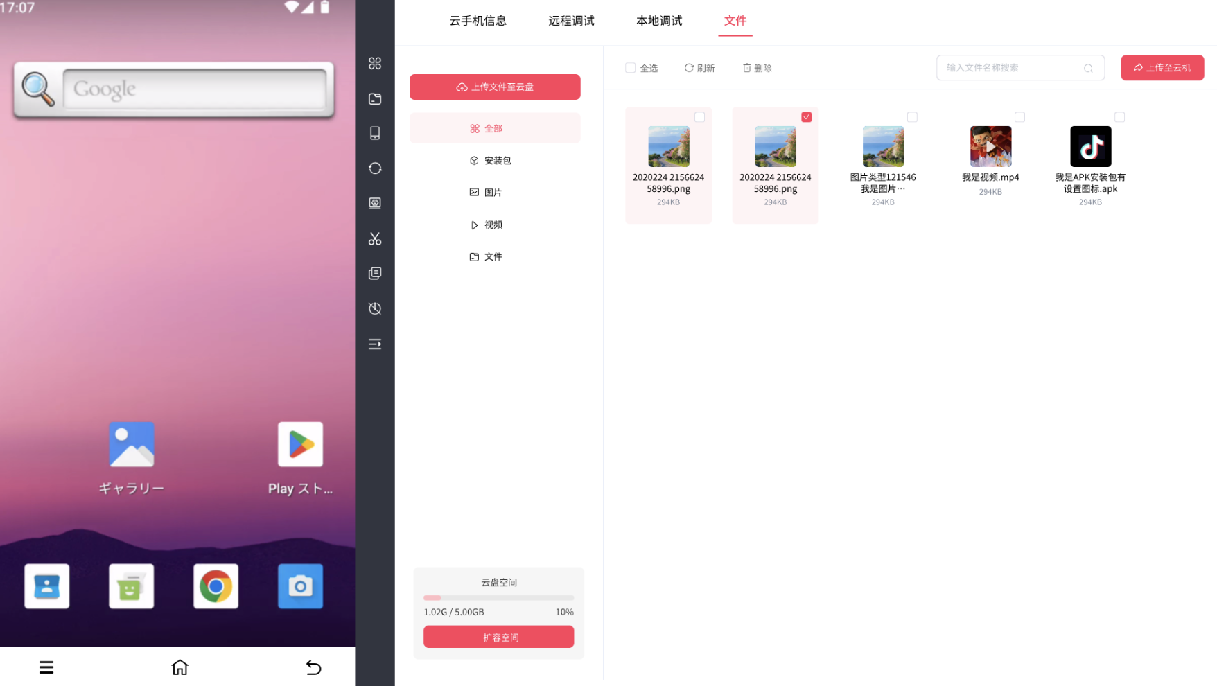 左侧展示的是云机投屏画面及云机相关操作按钮,右边展示的是云手机信息、云盘文件信息。