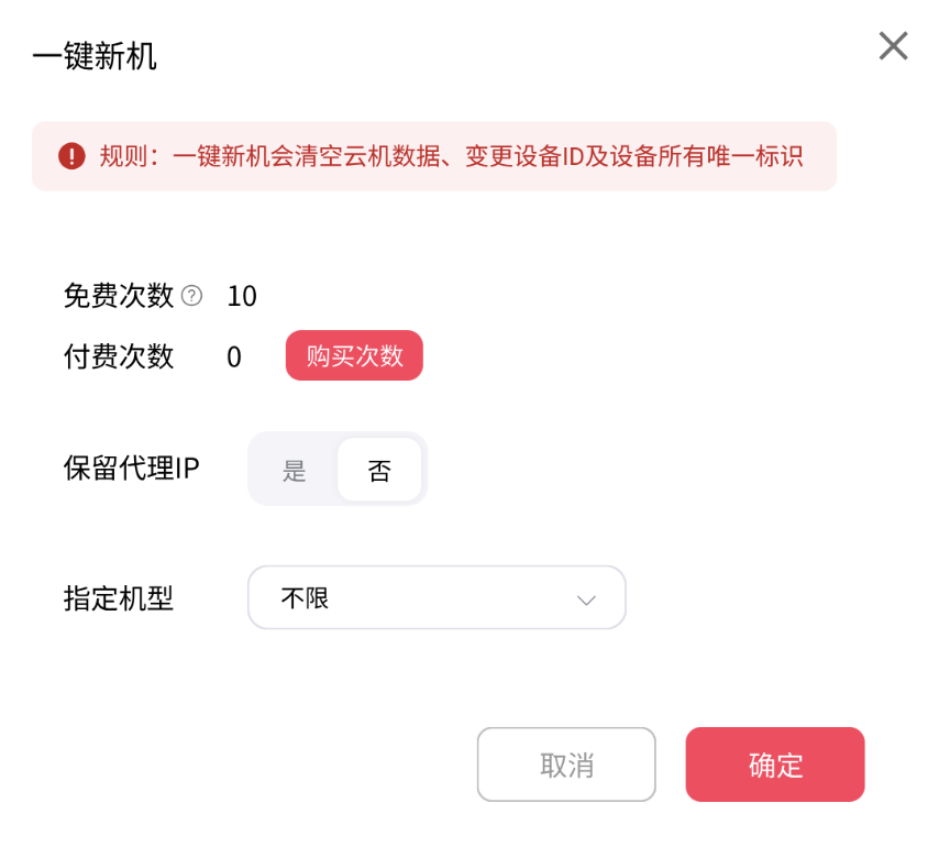 您可以额外购买一键新机次数,购买的一键新机次数可以用于所有云手机。