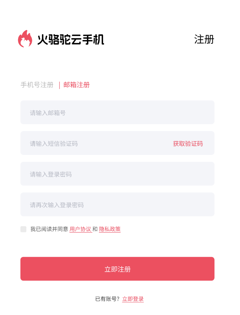 首先,您需要有一个火骆驼云手机平台的账号,注册地址:https://web.huoluotuo.com/login