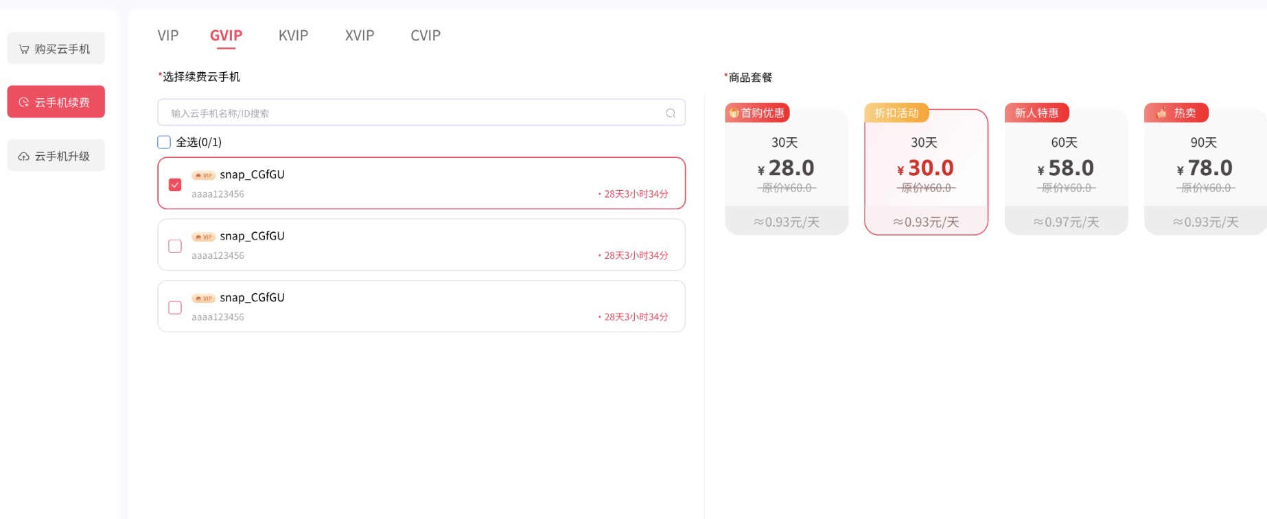 如果要续费云手机,需选择“购买/续费/升级”模块,点击云手机续费,选择您的云手机型号,再选择您要续费的套餐,选择支付方式,即可成功续费您的的云机。